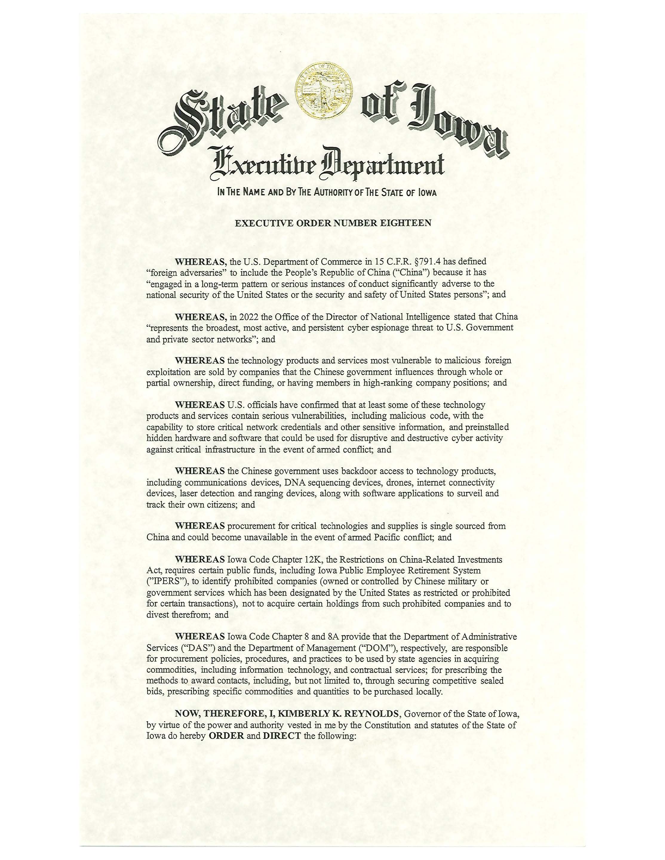 Iowa Governor Signs Executive Order Directing Yearly Risk Reviews